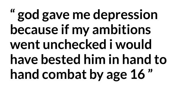 God Gave Me Depression Because If My Ambitions Went Unchecked I Would Have Bested Him In Hand To Hand Combat By Age 16
